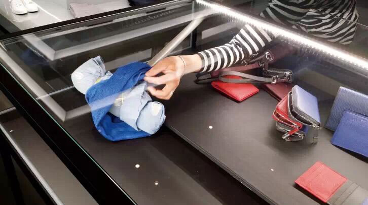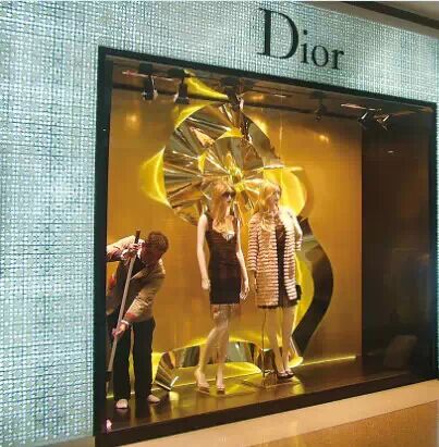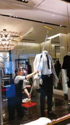 櫥窗美輪美奐,都由設計公司精心設計擺放,吊著(zhù)、懸著(zhù)、斜著(zhù)、散著(zhù)、撒著(zhù)的各種形式、各種姿態(tài)。貨品、主題,快的一周一換,最慢的也每月一換,求新求變求關(guān)注。每當更新擺放后,手印、落灰需要及時(shí)清理。有的對外櫥窗只容得下木頭模特兒,櫥窗保潔員怎么辦?找個(gè)最小最靈活的保潔員,從夾縫里擠進(jìn)去,臉幾乎會(huì )貼著(zhù)櫥窗,工作起來(lái)像演雜技般。千萬(wàn)要當心:不能破壞貨品擺設,這可是花大價(jià)錢(qián)大心思擺放的;要帶汗巾扎頭,汗水絕對不能滴下;要另一人在櫥窗外呼應著(zhù)對著(zhù)光指示要擦的手印或污處;要避開(kāi)周邊的射燈,因為很燙;刮玻璃下水時(shí),先在要地上墊上長(cháng)毛巾接水,不能讓水濺起來(lái),并避開(kāi)裝飾物。(如圖4、5)