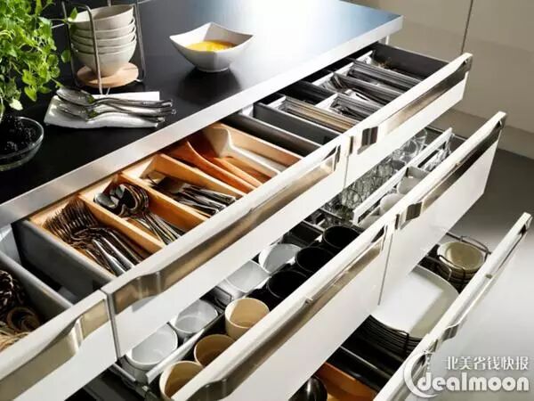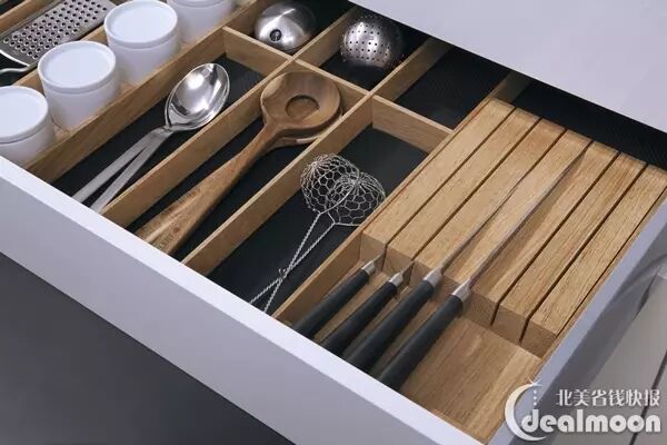 通常,靠近灶臺臺面的抽屜設計都是扁長(cháng)型的,方便收納刀叉等烹調工具。一方面,方便取用。另一方面,如果家里有小孩兒,會(huì )更加安全。值得提醒的是,注意材料的防潮性。