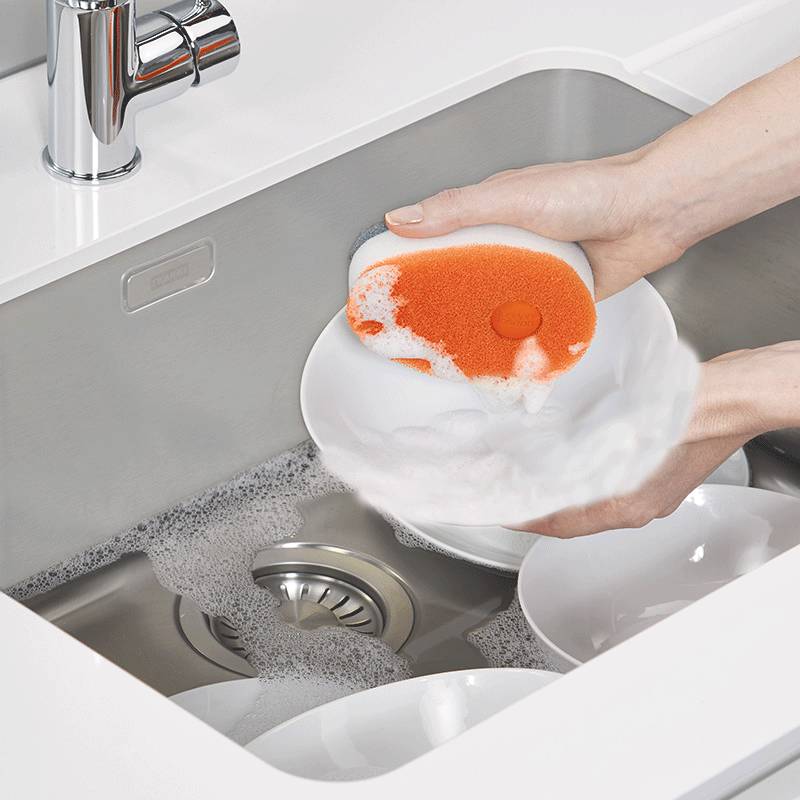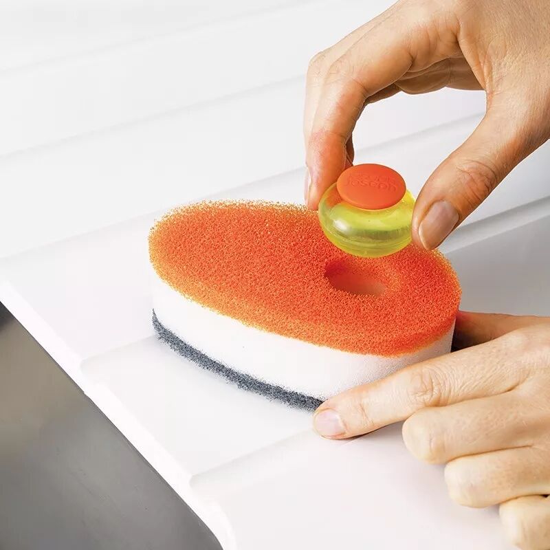 這款海綿洗碗刷的中間裝有一個(gè)清潔液小容器,洗碗的時(shí)候擠壓一下海綿,容器中的清潔液就會(huì )流出,用量也可以隨心調整。容器小巧可愛(ài),可隨時(shí)灌裝。
