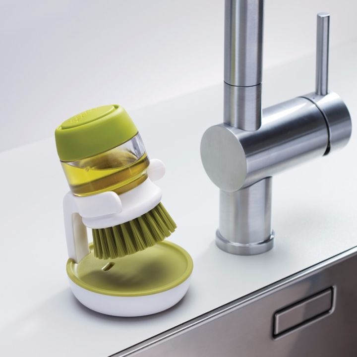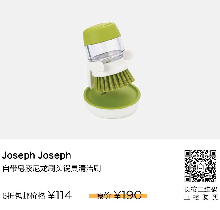 除了洗碗刷以外,Joseph Joseph的鍋刷也采用了自帶清潔液容器的設計。按壓頂部,就可以控制清潔液的用量,透明材質(zhì)讓余量一目了然。