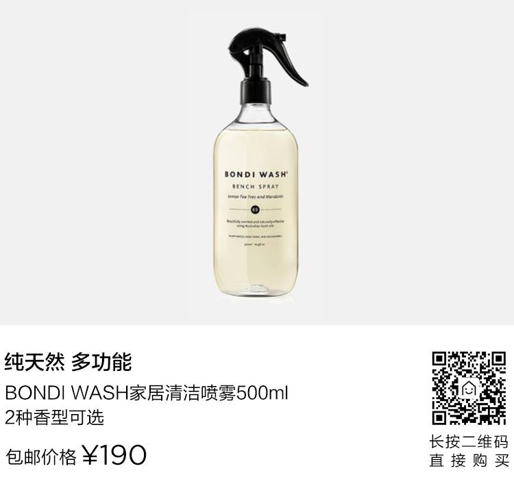 家居清潔噴霧是BONDI WASH的明星產(chǎn)品,你可以用它清潔家中任何堅硬平滑的物體表面,桌子、廚房灶臺、衛生間墻面瓷磚等等都能使用,噴灑之后用濕布或海綿擦拭就能去除污漬,同時(shí)還能殺滅細菌,相當于多了一道保護身體的屏障,尤其適合有嬰幼兒的家庭。