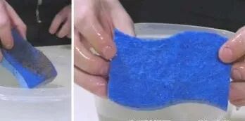 12. 海綿要是刷過(guò)燒焦物或是醬汁,難免會(huì )染色,只要倒入兩杯熱水和兩湯匙的鹽攪拌,放一個(gè)晚上再拿起來(lái)就變成新的海綿。