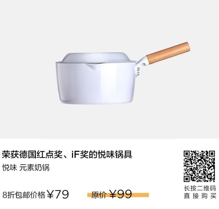 連續兩年(2016-2017)獲得紅點(diǎn)獎的悅味專(zhuān)為女性設計了一套名為“元素”的鍋具,采用輕量材質(zhì),重量是市面上同類(lèi)鍋型的三分之二,其中的奶鍋僅重500g,單手就可輕松提起。