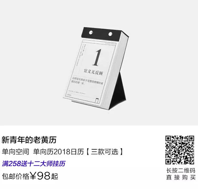 宜動(dòng)土,忌出行——這是爺爺奶奶輩兒的人用慣了的老黃歷上給出的行動(dòng)指南,而“新青年的老黃歷”單向歷則會(huì )告訴你,今天“宜義無(wú)反顧”,“忌畏首畏尾”。