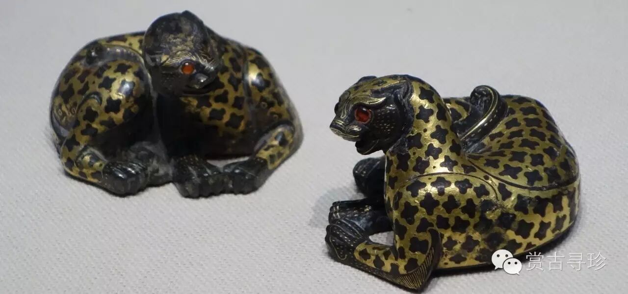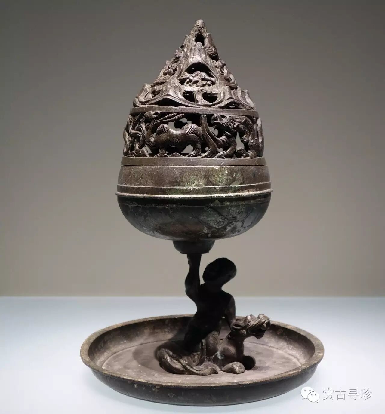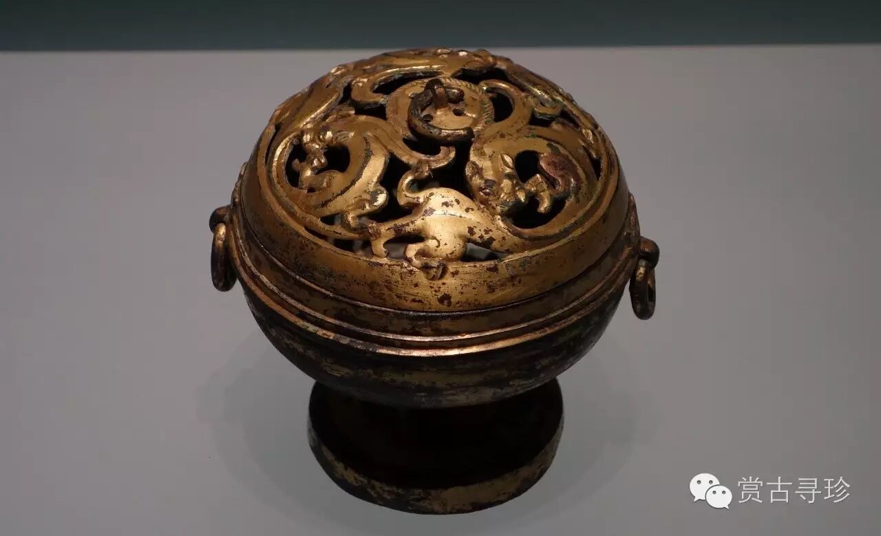 它爐身似豆形,通體用剛柔相濟的金絲和金片錯出舒展的云氣,把香料放入點(diǎn)燃,香煙通過(guò)爐蓋的許多小孔,裊裊上升,彌漫房中。博山,乃古代神話(huà)中的仙山,錯金是金銀鑲嵌的一種工藝。爐盤(pán)上部和爐蓋則鑄出高低起伏、挺拔峻峭的山巒,以象征陸地和群山。爐蓋上就山勢鏤孔,山巒間有神獸出沒(méi),虎豹奔走,機靈的小猴或是蹲在山峰高處或是騎在獸背上嬉戲玩耍,獵人則在山中巡獵。一幅秀麗生動(dòng)的自然山景就在工匠們的鬼斧神工中躍然而出。爐座把上透雕成三條蛟龍騰出波濤翻滾的海面狀,以龍頭擎托爐盤(pán),在爐座把上的山、海之間飾龍紋,蘊涵著(zhù)龍為溝通天、地、人三界的通天神獸的時(shí)代觀(guān)念。其工藝之精湛,舉世罕見(jiàn)。