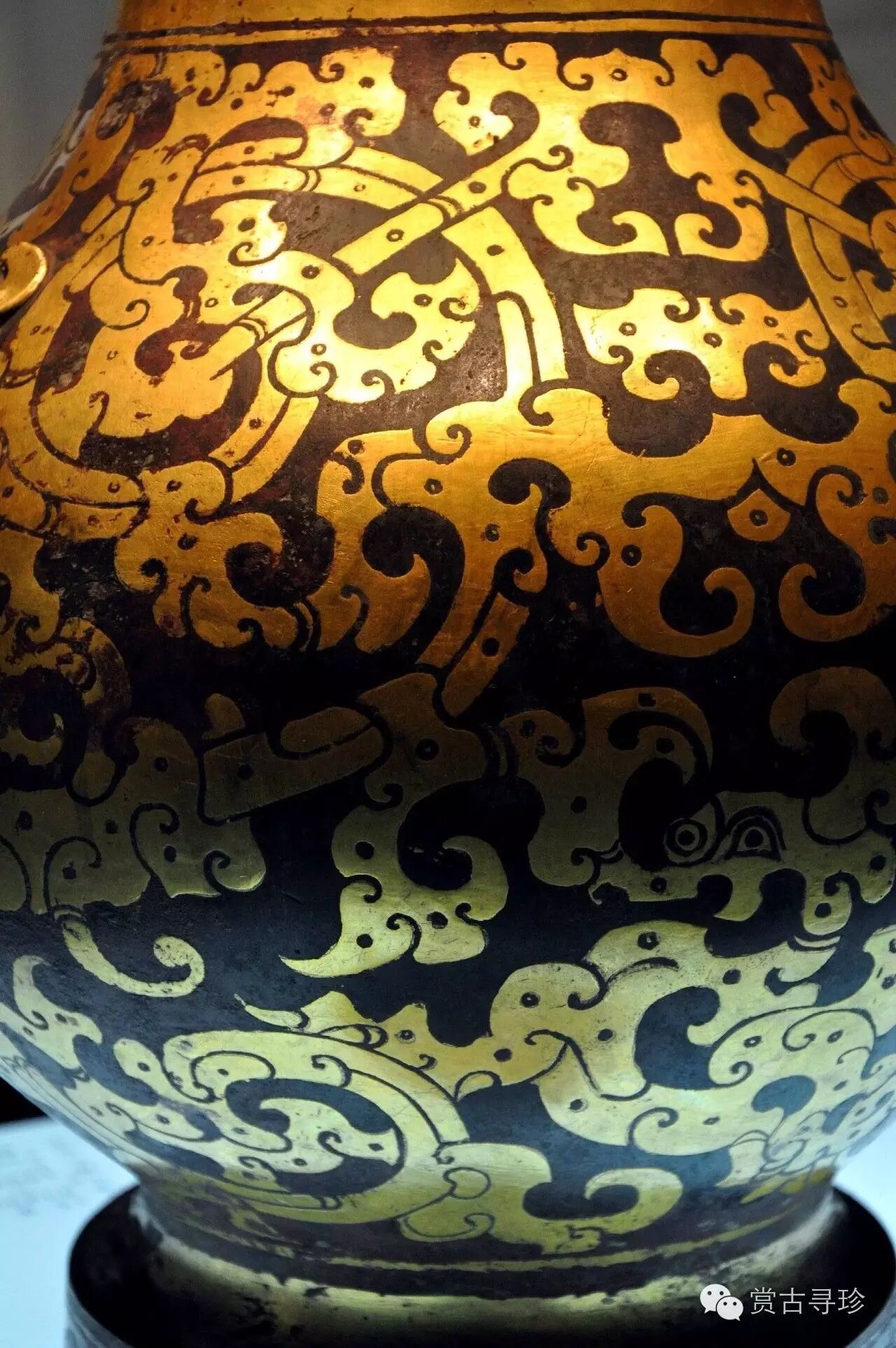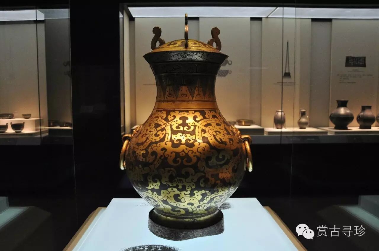 壺通體用鎏金、鎏銀工藝裝飾。全壺金銀相間,黃白互映,異常華麗。壺底銘文顯示此壺是主司膳食的官用來(lái)盛酒的器物。通高59.5厘米、腹徑37厘米,重16.25公斤,1968年滿(mǎn)城陵山中山靖王劉勝墓出土,侈口、束頸、鼓腹、圈足,腹部一對鋪首銜環(huán)。壺通體用鎏金、鎏銀工藝裝飾??诓亢腿ψ泔楒蹄y卷云紋帶,頸部飾金銀相間的三角紋帶,腹部飾四條獨首雙身的金龍相互翻卷蟠繞,并綴以金色卷云紋。鋪首鎏金。蓋面飾三只鎏金夔鳳,蓋緣飾鎏銀卷云紋,蓋豎三鎏銀云形鈕,卷云紐鎏銀。紋飾金銀相映,富麗堂皇。壺內壁髹朱漆一層。壺底銘刻:“楚大官,槽,容一石口,并重二鈞八斤十兩,第一”等字,鐫刻潦草不規整。