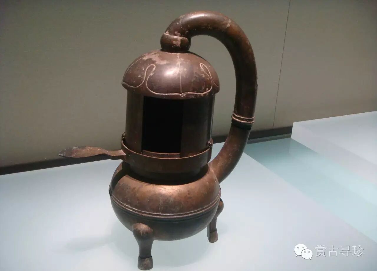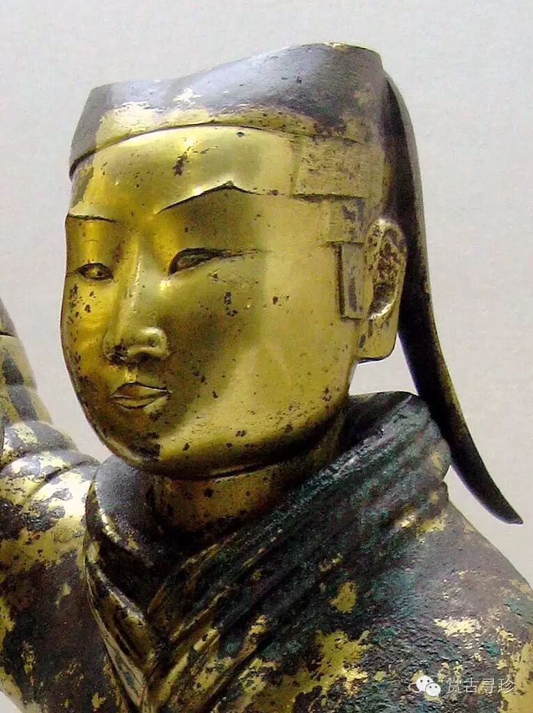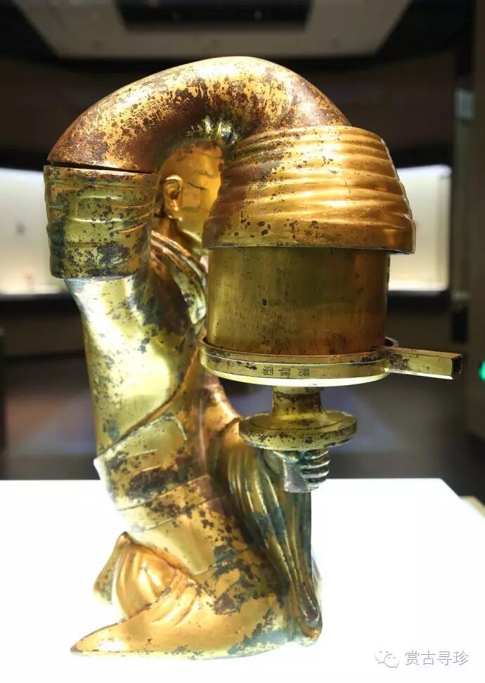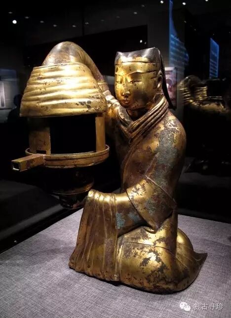 通體鎏金,作宮女跪坐執燈狀,燈的各部分是分鑄而成,可以隨時(shí)拆卸,但是結合起來(lái)卻天衣無(wú)縫,構成了一個(gè)完美的整體。它的燈盤(pán)可以轉動(dòng),燈罩在圓形軌道內可以開(kāi)合,所以就能根據需要調節光亮的大小和照射的方向。宮女的體內中空,燭火的煙滓可以通過(guò)宮女的右臂進(jìn)入體內,使煙滓停滯在燈身中,用以保持室內的清潔。其科學(xué)性令人嘆為觀(guān)止。難怪后來(lái)當這件文物在美國展出時(shí),前國務(wù)卿基辛格連聲驚嘆:中國人在兩千年前就有環(huán)保意識,中國了不起。在2000多年前,就能設計得如此精巧,實(shí)乃驚世之作;