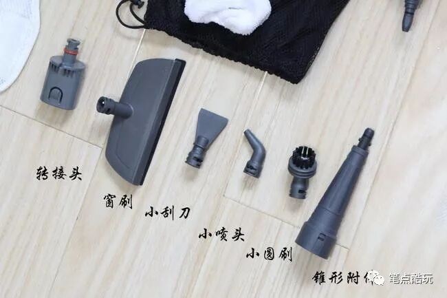 之前已經(jīng)展示了推桿拖把,下圖這些小部件與手持機相配,則可以組合出多種功能,這些小刷頭包括窗刷噴頭、圓刷噴頭、尖嘴噴頭以及刮刀。