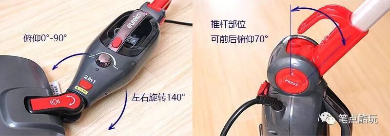 值得一提的是,eureka SC5的蒸汽拖把頭有非常靈活的前后左右旋轉自由度。在地拖與手持機連接口附近的關(guān)節,可以實(shí)現地拖左右旋轉140°,垂直角度可以俯仰0-90°;推桿與手持機連接處的關(guān)節則可以通過(guò)按下紅色圓形按鈕(印有Press字樣)來(lái)前后彎折最大70°,這樣一來(lái),拖地時(shí)遇到狹小角落,或者沙發(fā)、柜底、床下等低矮、難清潔的地方,eureka SC5都可以輕松進(jìn)退熏蒸清理,因此在使用時(shí)便利又省心。