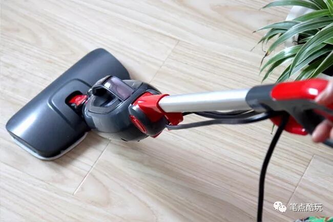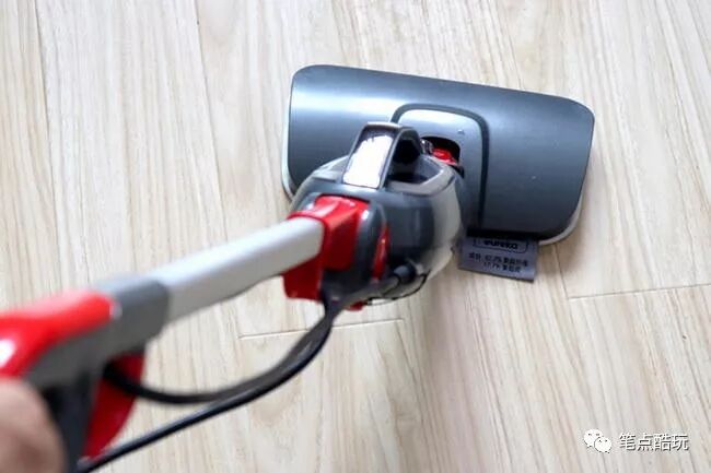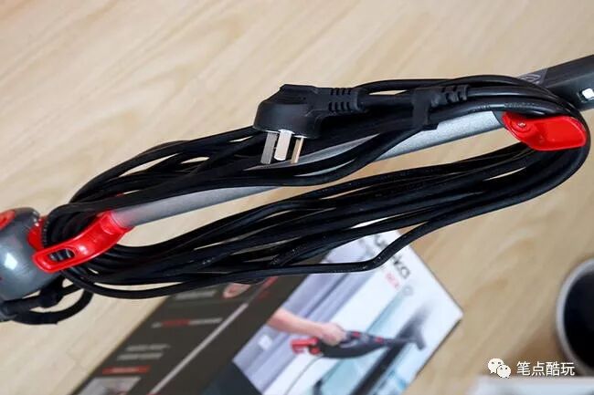 在組合成拖把形態(tài)之后,隨機自帶的超長(cháng)線(xiàn)纜即可隨時(shí)纏繞收納在推桿上下兩個(gè)紅色掛鉤之間,讓電源線(xiàn)再無(wú)纏繞隱患和收納時(shí)的不便。eureka還貼心的為線(xiàn)纜配備自粘捆扎帶,插頭附近特制橡膠卡扣,可以整理線(xiàn)纜后將此處一扣,利利索索,細節方面非常值得點(diǎn)贊。