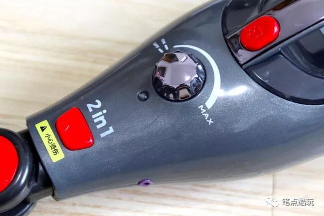 eureka蒸汽清潔機SC5的所有開(kāi)關(guān)也在手持握把的下方,其中一枚紅色按鍵是按壓式開(kāi)關(guān),再往下的黑色旋鈕則是蒸汽調節開(kāi)關(guān),可以關(guān)閉,或開(kāi)啟后調節到一定檔位,對應一定量的蒸汽釋放效果,對于頑固污漬清潔,蒸汽量檔位越大清理越快,當然消耗的水量也越多。最下方的紅色方塊不是按鍵,是手持機蒸汽出口與其他噴頭/刷頭的卡扣位置。