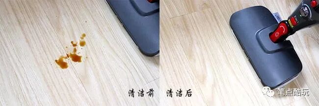 下面給大家展示一下我的使用體驗。注意在eureka蒸汽清潔機SC5之前,要打開(kāi)水箱蓋,用自帶的加水水杯加入2杯水量,蓋緊蓋子,即可啟用。那本厚的說(shuō)明書(shū)相關(guān)介紹比較詳細,這里我就不詳述了,只給大家看下eureka的清潔能力。首先是推桿拖把,幾乎一次就能將灑在地板上的污漬輕松擦凈。下圖為大家展示的地板清理前后的對比。
