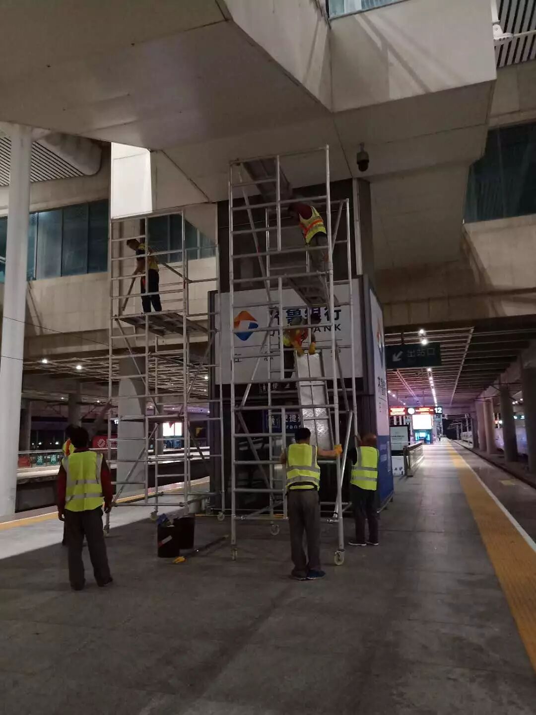 本次站臺高空保潔作業(yè)內容包括車(chē)站站牌、信息屏、邊組屏、出站指示牌、進(jìn)出站直梯、檢票口外墻玻璃等設備設施的清潔保養。為順利完成此項工作,濟南西站服務(wù)中心從現場(chǎng)勘察、會(huì )議研討,服務(wù)計劃制定、安全培訓等方面,全面做好準備工作。同時(shí),服務(wù)中心還成立了專(zhuān)項作業(yè)小組,由高鐵濟南公司總經(jīng)理王新?lián)谓M長(cháng),并帶領(lǐng)各級管理人員按照服務(wù)計劃方案,明確崗位職責,做好飲酒測查、測試工具安全性以及在作業(yè)完畢后全面清場(chǎng),每一項工作都認真仔細的完成。此外,車(chē)站還使用掃碼系統,對員工上站臺的每個(gè)工具粘貼條形碼,用于進(jìn)出站工具清點(diǎn)核對,對人員和物料的進(jìn)出嚴格把關(guān)。保障過(guò)程中,管理人員全程盯控,現場(chǎng)查看作業(yè)情況,督導工作進(jìn)度。經(jīng)過(guò)八天的奮戰,站臺面貌煥然一新。
