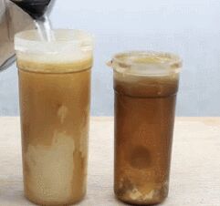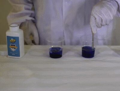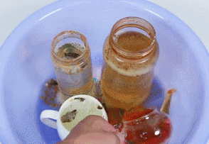 現向左手邊的杯子倒入清潔顆粒溶液