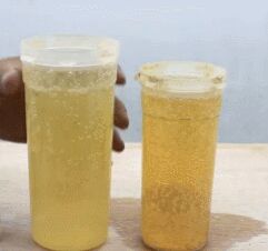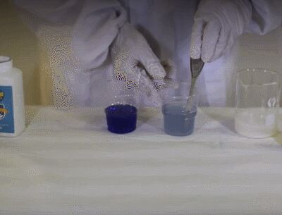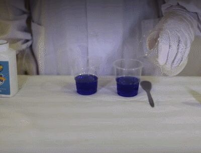 在兩個(gè)倒有常溫自來(lái)水的杯子里加入等量試劑攪拌